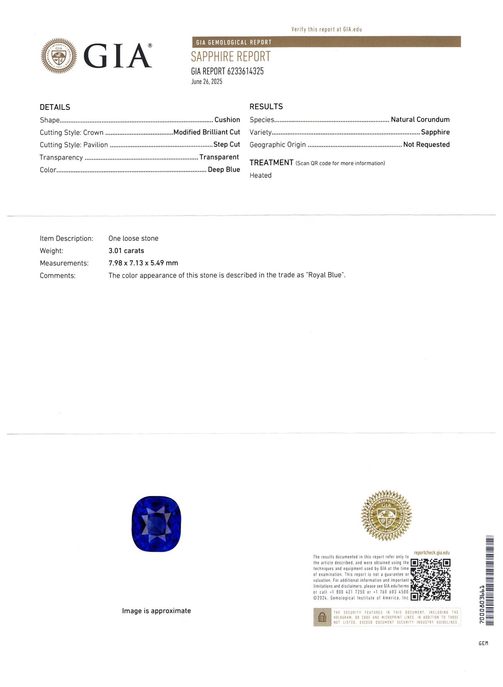 Blue Cushion Sapphire Sri Lanka H 8.0X7.0X5.0
