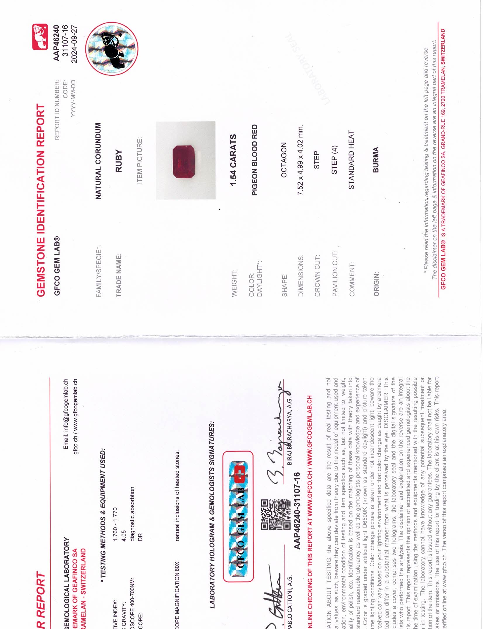 Red Emerald Cut Ruby Burma H 7.5X4.9X4.0